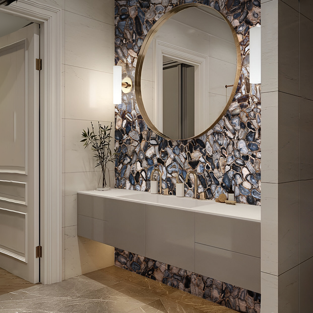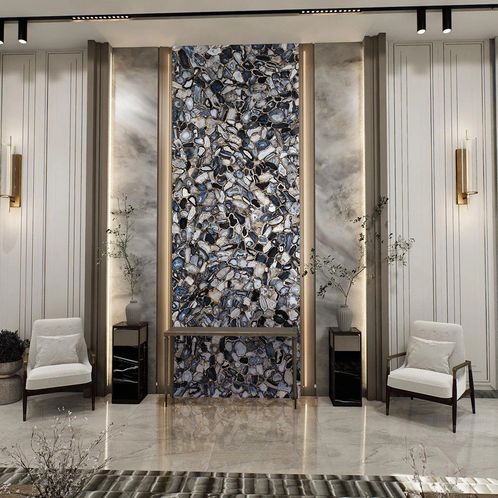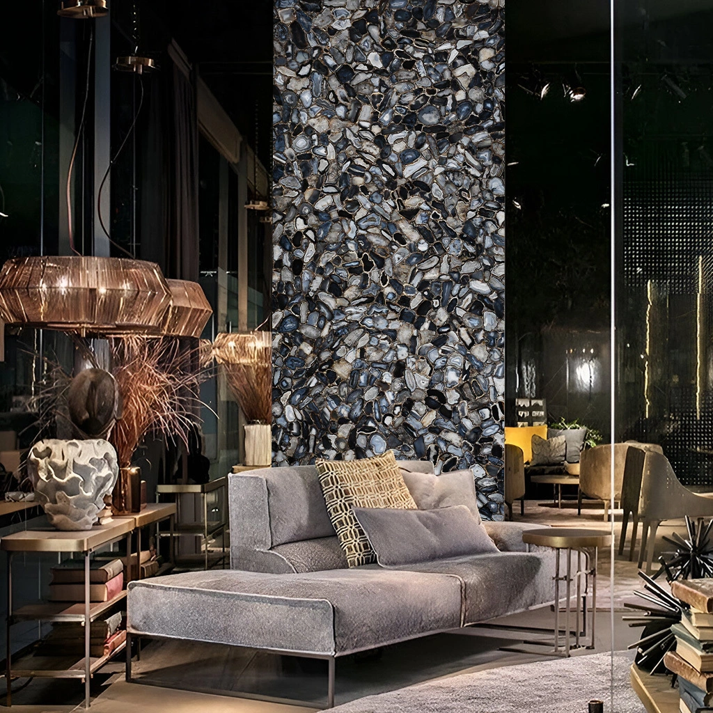 Black agate with a gold agate slab is a mesmerizing blend of elegance and opulence. The deep, rich tones of the black agate create a striking contrast with the shimmering gold accents. This unique combination makes for a sophisticated and luxurious addition to any interior space. Its natural beauty and intricate patterns provide a timeless appeal. Ideal for those seeking to infuse their homes with a touch of refined glamour and artistic charm.