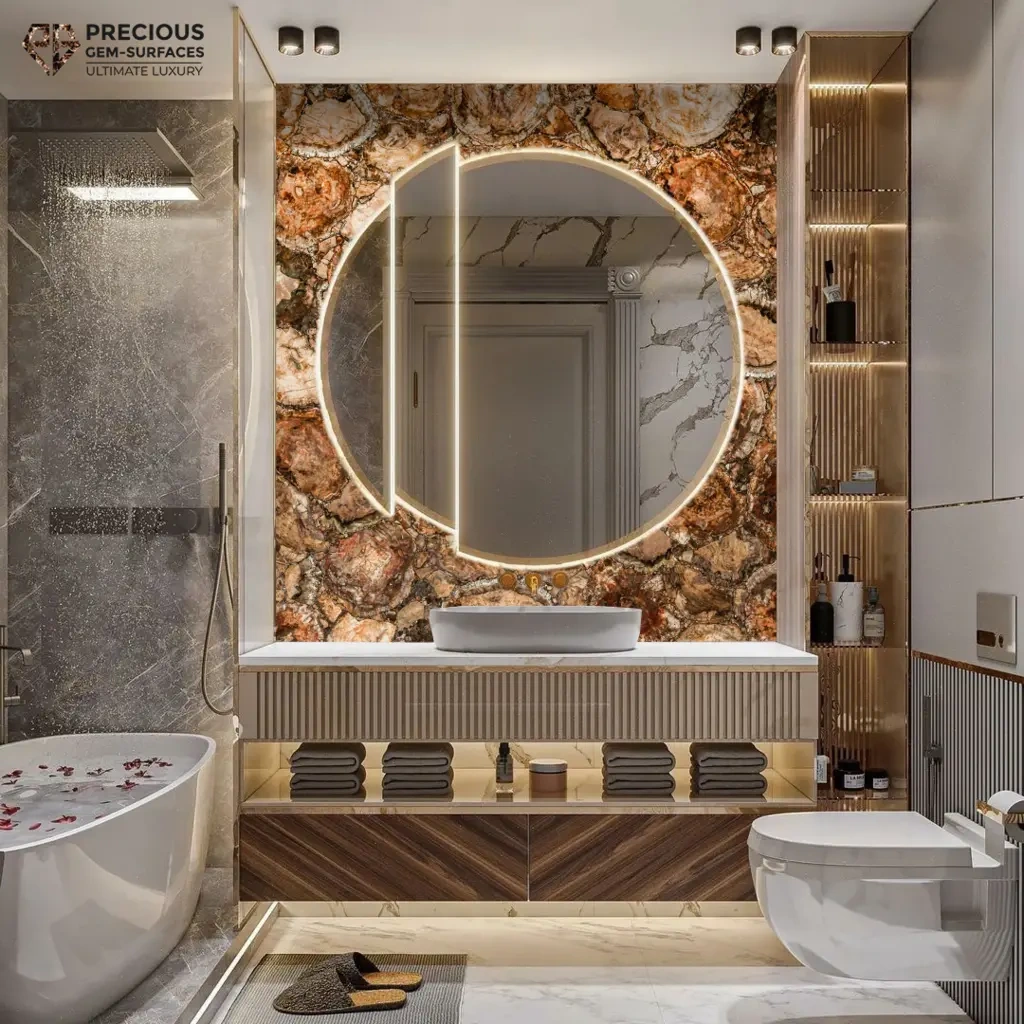 Discover the exquisite beauty of petrified wood agate, where ancient trees meet vibrant gemstones. Each piece tells a story millions of years in the making, showcasing unique patterns and rich colors. Our meticulous craftsmanship ensures that every surface is a masterpiece, blending nature's artistry with modern elegance. Ideal for countertops, tabletops, and decorative panels, these creations bring timeless sophistication to any space. Experience the allure of petrified wood agate with Precious Gem Surfaces, Kishangarh.
